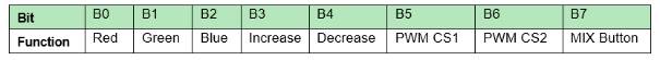 B5和B6 bit負(fù)責(zé)選擇PWM信號(hào)將通過的引腳(顏色):這些bit的顏色指定如表3所示。最后一個(gè)bit B7負(fù)責(zé)激活自動(dòng)混合功能。