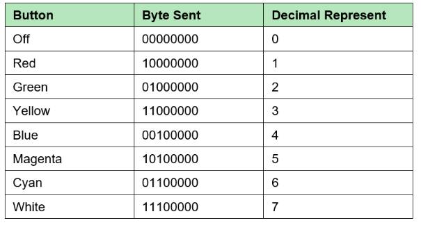 前三個(gè)bit:B0、B1和B2將通過預(yù)定義顏色的按鈕在直接控制模式下保持RGB LED的狀態(tài)。因此,當(dāng)單擊其中任意一個(gè)按鈕時(shí),將發(fā)送該按鈕的相應(yīng)值,如表2所示。