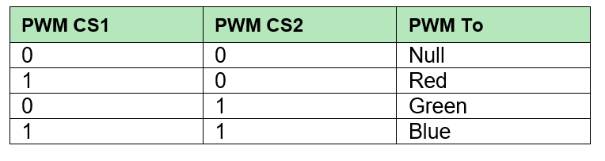 在第一部分,用戶選擇他們希望PWM信號(hào)通過的LED引腳;PWM信號(hào)一次只能傳遞到一個(gè)引腳。下面的列表在PWM模式期間邏輯地控制其他兩種顏色的開/關(guān)。