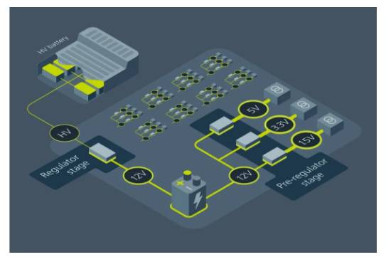 維護一款 12V 的物理電池,就意味著維護一個具有不必要冗余的低效率 PDN。在典型的汽車 12V PDN 中,所有連接 12V 母線的 12V 負載都有內(nèi)部前置穩(wěn)壓器,可將寬輸入電壓范圍(通常從 6V 到 16V)轉(zhuǎn)換為 5V、3.3V 或更低電壓。從全球系統(tǒng)角度來看,無論是電動汽車、混合動力汽車,還是插電式混合動力汽車,都有串聯(lián)穩(wěn)壓器冗余。一款從高壓到 12V 的 DC-DC 轉(zhuǎn)換器可為 12V 母線(效率高)穩(wěn)壓,而前置穩(wěn)壓器則可為每個負載提供合適的內(nèi)部電壓(圖 1)。