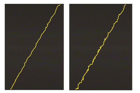 由機(jī)器人手臂握住4mm金屬彈頭繪制的線圖。左側(cè)的圖反映了高SNR觸摸控制器的使用;右邊是一個(gè)低信噪比的觸摸控制器。