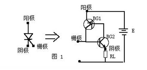我們可以把從陰極向上數(shù)的、二、三層看面是一只NPN型號(hào)晶體管,而二、三、四層組成另一只PNP型晶體管。其中第二、第三層為兩管交迭共用?僧嫵鰣D1的等效電路圖。當(dāng)在陽(yáng)極和陰極之間加上一個(gè)正向電壓E,又在控制極G和陰極C之間(相當(dāng)BG2的基一射間)輸入一個(gè)正的觸發(fā)信號(hào),BG2將產(chǎn)生基極電流Ib2,經(jīng)放大,BG2將有一個(gè)放大了β2 倍的集電極電流IC2 。因?yàn)锽G2集電極與BG1基極相連,IC2又是BG1 的基極電流Ib1 。BG1又把Ib1(Ib2)放大了β1的集電極電流IC1送回BG2的基極放大。如此循環(huán)放大,直到BG1、BG2完全導(dǎo)通。事實(shí)上這一過程是“一觸即發(fā)”的,對(duì)可控硅來說,觸發(fā)信號(hào)加到控制極,可控硅立即導(dǎo)通。導(dǎo)通的時(shí)間主要決定于可控硅的性能。