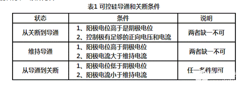 由于可控硅只有導(dǎo)通和關(guān)斷兩種工作狀態(tài),所以它具有開關(guān)特性,這種特性需要一定的條件才能轉(zhuǎn)化,此條件見表1