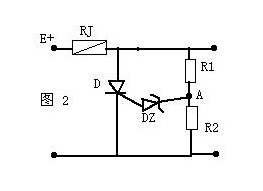如圖2是一個(gè)電視機(jī)常用的過壓保護(hù)電路,當(dāng)E 電壓過高時(shí)A點(diǎn)電壓也變高,當(dāng)它高于穩(wěn)壓管DZ的穩(wěn)壓值時(shí)DZ道通,可控硅D受觸發(fā)而道通將E 短路,使保險(xiǎn)絲RJ熔斷,從而起到過壓保護(hù)的作用。