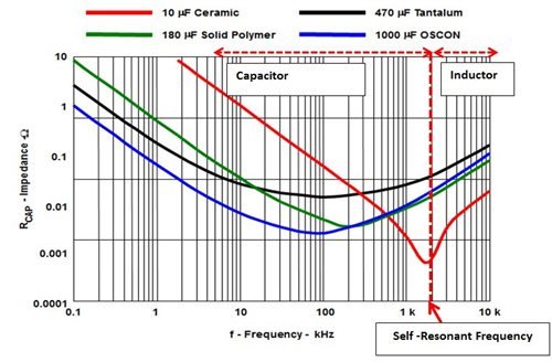 我們可以使用電容組合使阻抗曲線“變平”,以在推高降壓轉(zhuǎn)換器的開關(guān)頻率的同時,使其仍處于電容區(qū)域內(nèi)。電容阻抗因技術(shù)和開關(guān)頻率而異。