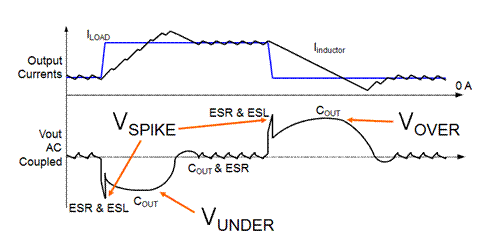 如下文圖5-6所示,電容的輸出電壓過沖、下沖和峰-峰電壓紋波計算值可用于確定電容。