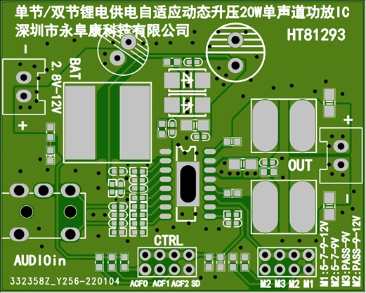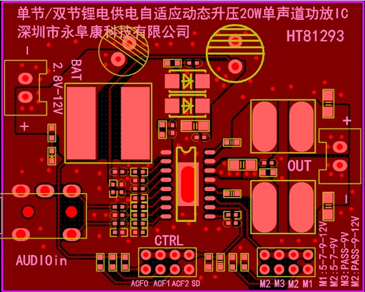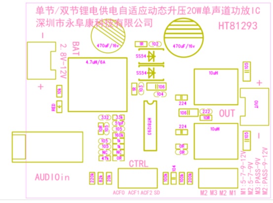 深圳市永阜康科技有限公司順應(yīng)拉桿音箱以及藍(lán)牙小音箱市場音質(zhì)功率升級的需求,推廣一款單節(jié)雙節(jié)鋰電供電內(nèi)置自適應(yīng)動態(tài)升壓20W單聲道D類功放IC-HT81293。采用最新的BCD工藝,內(nèi)部Boost模塊升壓至12V,已經(jīng)與鉛酸電池/三節(jié)串聯(lián)鋰電池的電壓持平,實現(xiàn)了單節(jié)鋰電供電極致功率輸出。