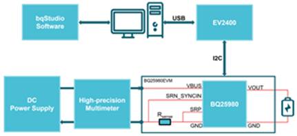 進(jìn)一步地,可以基于BQ25980的EVM板對(duì)該電流檢測(cè)方法進(jìn)行驗(yàn)證實(shí)驗(yàn)。具體的測(cè)試方案如圖3所示。