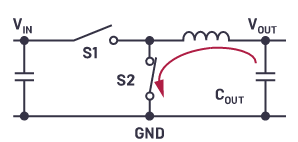 雖然簡單電壓轉(zhuǎn)換器可以從輸入電壓生成固定的輸出電壓,但在某些應(yīng)用中,這種特性是不夠的。一個例子是控制與電容相連的電壓節(jié)點(diǎn),這些電容可以充電至任何電壓。如果需要降低其電壓,則其必須部分放電。因此,在這樣的應(yīng)用中,電源必須能夠根據(jù)需要提供或吸收電流。這種轉(zhuǎn)換器稱為四象限D(zhuǎn)C-DC轉(zhuǎn)換器。對于這樣的應(yīng)用,可以使用具有輸出放電功能的電源。它可以讓輸出電容快速放電。圖1顯示了降壓型開關(guān)穩(wěn)壓器的這種功能。這里,在降壓轉(zhuǎn)換器關(guān)閉之后,開關(guān)S2長時間接通,輸出電容被放電。