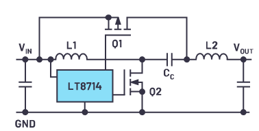 ADI LT8714 是用于四象限穩(wěn)壓器的控制器。它擁有此類調(diào)節(jié)所需的全部功能。例如,使用該IC可以精確維持0 V的電壓。圖3顯示了帶有控制器IC和功率級的簡化電路圖。后者由兩個電感L1和L2、兩個開關(guān)Q1和Q2以及耦合電容CC組成。有關(guān)每個象限中的相應(yīng)操作以及從一個象限到另一個象限的轉(zhuǎn)換行為的說明,請參閱LT8714數(shù)據(jù)手冊。