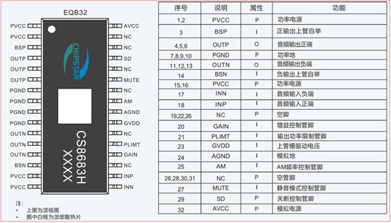 CS8683 130W/30V/4Ω EQB-32(散熱片在頂部,支持外接散熱器) 4.7V-45V 130W單聲道D類功放IC,具有AM干擾抑制功能