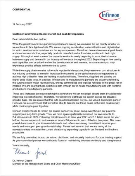 英飛凌在這份通知函中表示,目前全球芯片供應(yīng)仍處于緊張的狀態(tài),需求仍處于峰值水平,大多數(shù)的半導(dǎo)體產(chǎn)品,特別是交由晶圓代工廠生產(chǎn)的半導(dǎo)體產(chǎn)品,仍是供不應(yīng)求。盡管至少部分產(chǎn)能緊張的產(chǎn)品正在慢慢開始緩解,但我們行業(yè)的供需失衡將在2022年持續(xù)下去。