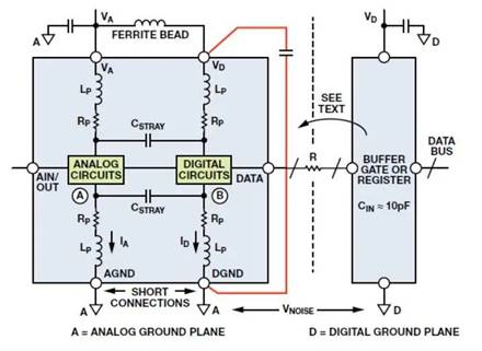 不過,為了防止進(jìn)一步耦合,AGND 和 DGND 應(yīng)通過最短的引線在外部連在一起,并接到模擬接地層。DGND 連接內(nèi)的任何額外阻抗將在 B點產(chǎn)生更多數(shù)字噪聲;繼而使更多數(shù)字噪聲通過雜散電容耦合至模擬電路。請注意,將 DGND 連接到數(shù)字接地層會在 AGND 和 DGND 引腳兩端施加VNOISE,帶來嚴(yán)重問題!