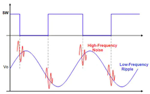 最容易觀察到的噪音,也是能直接影響電路性能的噪音就是開關(guān)頻率下的紋波。這種紋波通常在 10 - 20 mV 的范圍內(nèi)(圖 1 )。雖然這種紋波在本質(zhì)上不是隨機(jī)的,但仍然是一種會(huì)造成系統(tǒng)性能影響的噪音表現(xiàn)。這種紋波的毫伏水平對(duì)于工作電壓為 5 V 伏及以上的高電壓數(shù)字集成電路來說通常不會(huì)帶來任何問題,但對(duì)于工作電壓低于 3 V 的低電壓數(shù)字電路來說,就是一個(gè)不可忽略的問題。電源軌上的波紋也是精密模擬電路和元件的一個(gè)主要問題,這就是為什么這類設(shè)備的電源抑制比 (PSRR) 規(guī)格至關(guān)重要。