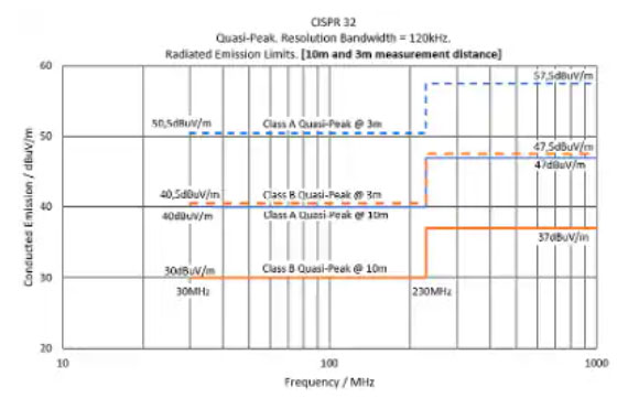 圖 2:這是 CISPR 32/EN 55032 提供的眾多圖表之一,它定義了各類消費(fèi)產(chǎn)品的發(fā)射限制與頻率的關(guān)系。(圖片來源:Academy of EMC,《EMC 標(biāo)準(zhǔn)》)