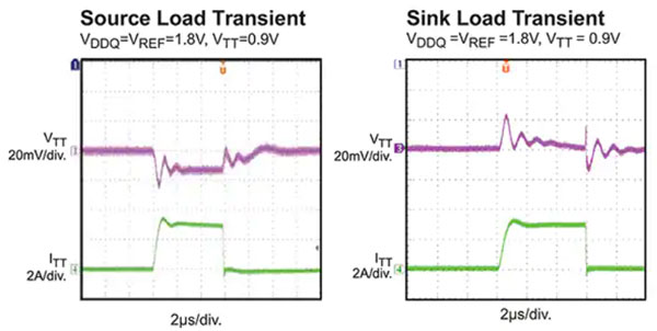 MP20075 的集成分壓器跟蹤參考電壓 (REF),可確保準(zhǔn)確的 VTT 和 VTTREF 輸出電壓,而開爾文檢測(cè)則有助于實(shí)現(xiàn) VTT 的 ±30 mV 和 VTTREF 的 ±18 mV 精度。此外,與大多數(shù) LDO 一樣,純模擬的閉環(huán)拓?fù)浣Y(jié)構(gòu)對(duì)輸出負(fù)載的瞬態(tài)響應(yīng)非?,只需幾微秒的時(shí)間(圖 4)。這種瞬態(tài)響應(yīng)在高速電路中往往是至關(guān)重要的,例如本 LDO 的設(shè)計(jì)目標(biāo):DDR SRAM 端接。