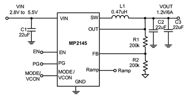 圖 5:MP2145 是一款 5.5 V、6 A 同步降壓開關(guān)穩(wěn)壓器,在其 2×3 mm QFN 封裝中含有完整的 20 mΩ 和 12 mΩ MOSFET。(圖片來源:Monolithic Power Systems)