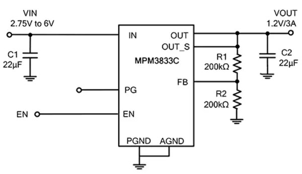 例如,MPM3833C 是一款降壓模塊,內(nèi)置功率 MOSFET 和一個(gè)電感器,能夠在 2.75 V 至 6 V 輸入電壓下提供高達(dá) 3 A 的連續(xù)輸出電流,同時(shí)具有出色的負(fù)載和線路調(diào)節(jié)能力(圖 8)。只需反饋電阻、輸入電容和輸出電容即可完成設(shè)計(jì)。電感器通常是最難指定和放置的外部元器件,但對(duì)于模塊來講電感器是內(nèi)部器件,因此在為了盡量減少電磁干擾 (EMI) 和紋波而需考慮合適的放置位置已不再是一個(gè)問題了。
