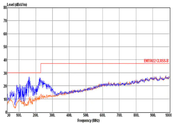 圖 9:MPM3833C DC/DC 模塊的數(shù)據(jù)表顯示,該器件很容易滿足 EN55022 B 類標(biāo)準(zhǔn)的輻射排放要求。(圖片來源:Monolithic Power Systems)