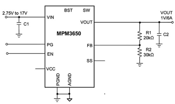 圖 10:MPM3650 模塊采用集成電感,在不超過 1.8 V 的電壓下輸出電流可達(dá) 6 A,在 1.8 V 以上時(shí)輸出電流為 5 A,封裝尺寸為 4 mm × 6 mm × 1.6 mm。(圖片來源:Monolithic Power Systems)
