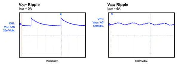 圖 11:MPM3650 模塊的規(guī)定紋波噪音在零負(fù)載時(shí)約為 20 mV,滿載時(shí)約為 5 mV。(圖片來源:Monolithic Power Systems)