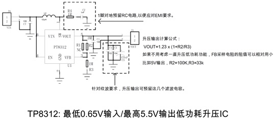 (2)TP8312在單節(jié)鋰電可以輸出5V/500毫安,而一般電荷泵升壓輸出是5V/200毫安,其低EMI特性避免對FM收音及無線麥克風(fēng)的干擾;