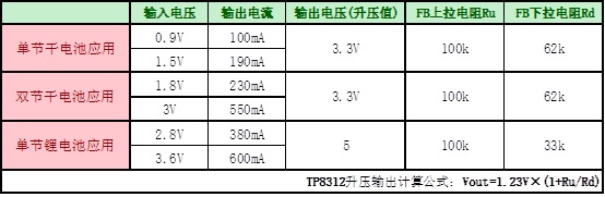 單節(jié)干電池/雙節(jié)干電池/單節(jié)鋰電池應(yīng)用,升壓輸出電壓/電流以及對應(yīng)FB管腳設(shè)置電阻值: