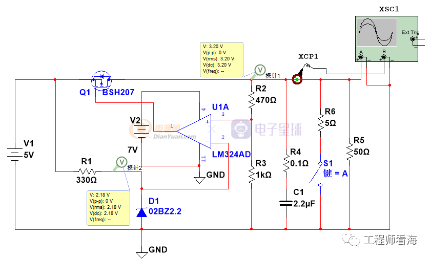 我們以PMOS LDO為例來仿真下ESR對LDO輸出的影響,LDO輸出電壓為3.2V,輸出電容為2.2uF,ESR是R4我們選取為0.1Ω,負載為50Ω(負載電流為3.2/50=70mA),當開關(guān)S1閉合時,負載為R6和R5的并聯(lián),此時負載電流大約是700mA,我們仿真的方法就是改變ESR電阻R4,切換負載電流,觀察輸出電壓的變化。
