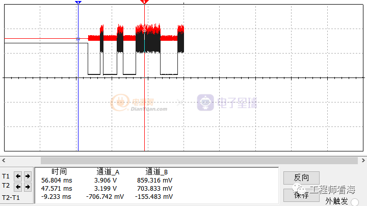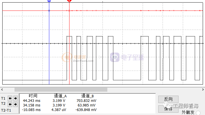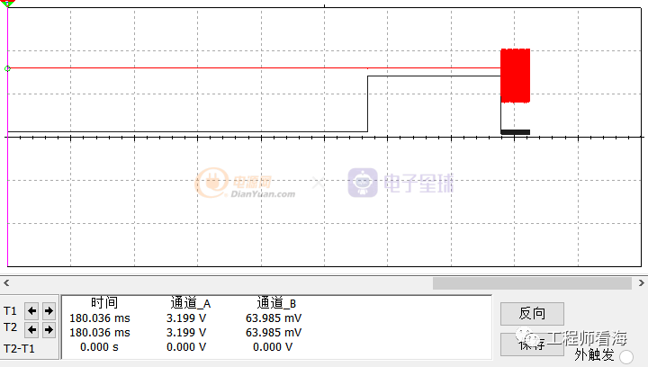 下圖是把ESR改為100Ω后的結(jié)果,剛開始輸出是穩(wěn)定的,切換負載電流時,輸出也容易出現(xiàn)異常。