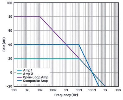 但是,您可以使用兩個(gè)單獨(dú)的放大器來構(gòu)建這種放大器,形成復(fù)合放大器。將兩個(gè)運(yùn)算放大器組合在一起,就能將各自的優(yōu)勢特性集成于一體。這樣,與具有相同增益的單個(gè)放大器相比,兩個(gè)運(yùn)算放大器組合可以實(shí)現(xiàn)更高的帶寬。