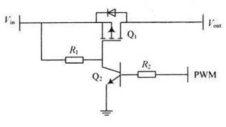 設計的控制器屬于串聯(lián)型,即控制充電的開關是串聯(lián)在電池板與蓄電池之間的。串聯(lián)型控制器相對于并聯(lián)型控制器能夠更有效地利用太陽能,減少系統(tǒng)的發(fā)熱量。設計中用MOSFET實現(xiàn)開關。MOSFET是電壓控制單極性金屬氧化物半導體場效應晶體管,所需驅動功率較小。而且MOSFET只有多數(shù)載流子參與導電,不存在少數(shù)載流子的復合時間,因而開關頻率可以很高,特別適合作為PWM控制充電開關。為此,設計中采用P溝道MOSFET。P溝道MOSFET的導通電壓Vth<0,由圖4可以實現(xiàn)MOSFET的驅動。當Q2導通時,由于Q2的Vce很小,可以認為Q1的G極接地,Vgs<0,當Vin達到一定值時,Q1導通。