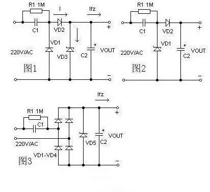 電容降壓式簡(jiǎn)易電源的基本電路如圖1,C1為降壓電容器,D2為半波整流二極管,D1在市電的負(fù)半周時(shí)給C1提供放電回路,D3是穩(wěn)壓二極管,R1 為關(guān)斷電源后C1的電荷泄放電阻。在實(shí)際應(yīng)用時(shí)常常采用的是圖2的所示的電路。當(dāng)需要向負(fù)載提供較大的電流時(shí),可采用圖3所示的橋式整流電路。整流后未經(jīng)穩(wěn)壓的 直流電壓一般會(huì)高于30伏,并且會(huì)隨負(fù)載電流的變化發(fā)生很大的波動(dòng),這是因?yàn)榇祟愲娫磧?nèi)阻很大的緣故所致,故不適合大電流供電的應(yīng)用場(chǎng)合。