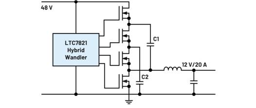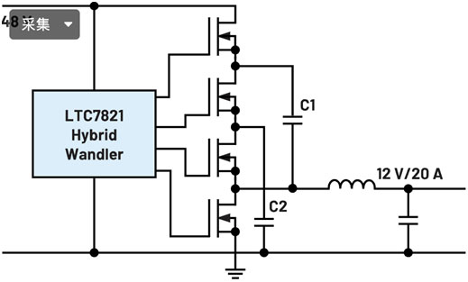 除了這些明顯的調(diào)整之外,還有涉及開關(guān)穩(wěn)壓器拓?fù)浣Y(jié)構(gòu)的方法。LTC7821 混合轉(zhuǎn)換器就是一個(gè)例子。它將電荷泵與降壓轉(zhuǎn)換器相結(jié)合,在電源電壓轉(zhuǎn)換為較低電壓時(shí)可實(shí)現(xiàn)非常高的效率。對(duì)于48 V至12 V轉(zhuǎn)換,在20 A輸出電流和500 kHz開關(guān)頻率的條件下,可以實(shí)現(xiàn)97.3%的轉(zhuǎn)換效率。使用標(biāo)準(zhǔn)商用硅MOSFET可產(chǎn)生240 W的輸出功率。圖1說明了混合降壓轉(zhuǎn)換概念。損耗之所以如此之低,是因?yàn)殡姾杀玫墓ぷ餍蕵O高,而且由于電源電壓已經(jīng)減半,下游降壓轉(zhuǎn)換器可以在最優(yōu)電壓范圍內(nèi)工作。