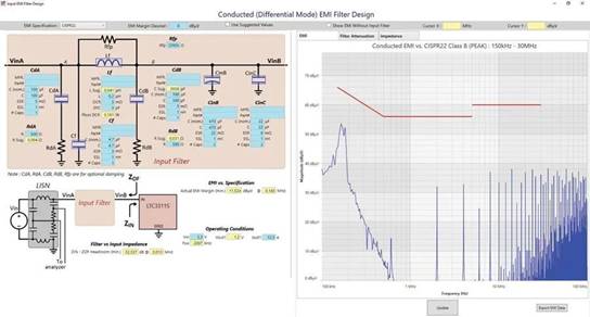 在經(jīng)過認(rèn)證的測(cè)試實(shí)驗(yàn)室進(jìn)行EMI測(cè)量的成本很高。修改已經(jīng)開發(fā)好的硬件也很昂貴。因此,電壓轉(zhuǎn)換電路設(shè)計(jì)的另一個(gè)重要支柱是使用ADI LTpowerCAD®等工具進(jìn)行EMC優(yōu)化。在開發(fā)過程中使用仿真工具實(shí)現(xiàn)EMC優(yōu)化具有巨大的潛力。圖3顯示了作為LTpowerCAD開發(fā)環(huán)境一部分的EMI濾波器設(shè)計(jì)器。利用此工具可以計(jì)算開關(guān)穩(wěn)壓器的傳導(dǎo)發(fā)射,如果干擾太高,可以設(shè)計(jì)濾波器來提供補(bǔ)救措施。