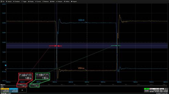 在圖 2 中,低壓側(cè) FET (VGS LO) 關(guān)斷和高壓側(cè) FET (VGS Hi) 導(dǎo)通之間的延遲是1.498 ns。另一種情況是,在高壓側(cè)場效應(yīng)管關(guān)斷和低壓側(cè)場效應(yīng)管導(dǎo)通期間,延遲為 1.166 ns。如果這兩個測量的延遲都為正,空載時間是可以接受的。注意,測量是在 PWM 控制器輸出的最大脈寬下進行的。
