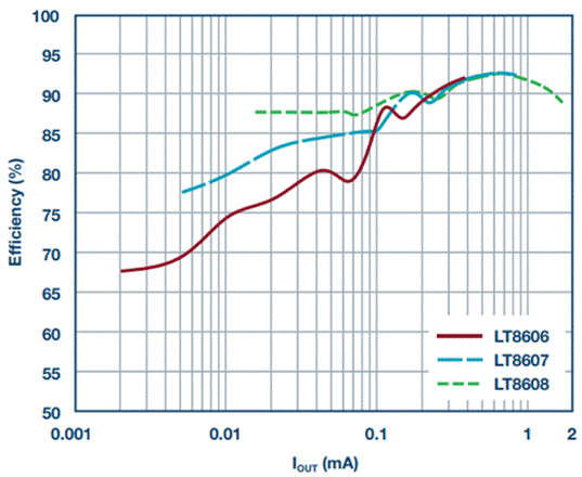 對于電池供電型應(yīng)用來說,在輕負(fù)載運行和無負(fù)載待用模式期間,高效率和低閑置電流是非常重要的特性。LT8606/LT8607/LT8608的2.5