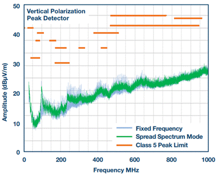 MHz工作頻率最大限度縮減了解決方案尺寸,但是它們也實現(xiàn)了卓越的EMI性能,這是因為采用了先進(jìn)的工藝技術(shù)。開關(guān)頻率的擴(kuò)展頻譜模式操作能夠進(jìn)一步降低EMI輻射。圖4給出了圖1所示解決方案的CISPR