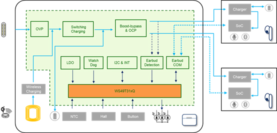 WS49T31xQ系列對功耗進(jìn)行了優(yōu)化設(shè)計, Standby mode功耗控制在1.5μA以下,低功耗特性大幅延長整機(jī)的續(xù)航時間,非常適合電池供電設(shè)備的應(yīng)用。另外,數(shù)字,模擬,Core獨(dú)立供電設(shè)計,數(shù)字接口可通過VDDIO自由選擇1.8V~3.3V邏輯電平,極大的方便了外設(shè)的連接。我們?nèi)砸訲WS耳機(jī)盒應(yīng)用為例,與耳機(jī)通訊的UART接口設(shè)定為1.8V電平,ADC可以工作在3.3V,這樣既可直接適配耳機(jī)端通信,又能夠保證ADC采集的精度和量程,節(jié)省了電平轉(zhuǎn)換的成本。最后,獨(dú)立PWM模塊可直接驅(qū)動2顆RGB LED,進(jìn)一步節(jié)省了外圍元器件。