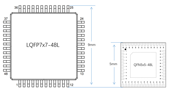 WS49T31xQ系列采用QFN5x5-48L封裝,相對于傳統(tǒng)LQFP7x7-48L封裝,尺寸縮小近70%。小型化封裝大幅降低了PCB的占用,對可穿戴或便攜式設(shè)備的ID設(shè)計十分友好。