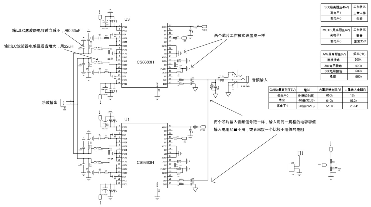 兩顆CS8683并聯(lián)輸出單聲道200W/4歐應(yīng)用原理圖