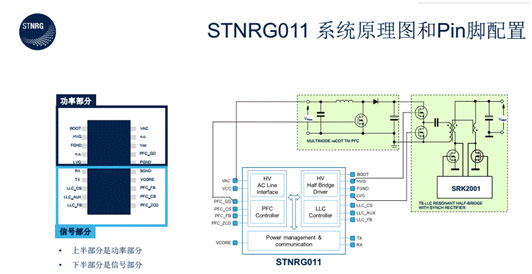 本方案采用了主流的PFC+LLC架構(gòu),主控IC是ST的STNRG011,這顆IC整合了雙端LLC諧振半橋控制器、多模式功率因數(shù)校正(PFC)控制器和運(yùn)行同類最佳控制算法的數(shù)字內(nèi)核。片上集成的數(shù)字外設(shè)利用ST的SMED(狀態(tài)機(jī)事件驅(qū)動(dòng))技術(shù)和專有模擬硬件,提升了控制回路的處理性能,可實(shí)現(xiàn)出色的動(dòng)態(tài)響應(yīng)。此外,STNRG011芯片上還配備非易失性存儲(chǔ)器,用于存儲(chǔ)專用參數(shù)。