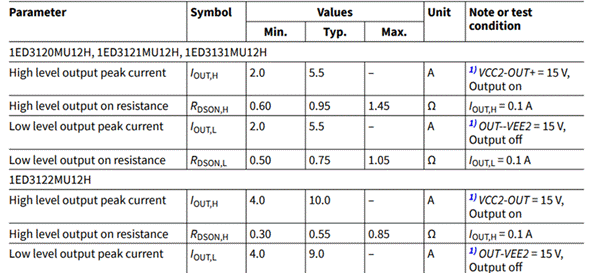 首先來(lái)看一下這個(gè)驅(qū)動(dòng)峰值電流的定義方式。這個(gè)很重要,不同公司的產(chǎn)品往往宣傳說(shuō)法不一樣,所以要參考規(guī)格書(shū)。以下圖1是英飛凌的1EDI系列產(chǎn)品的電流表。比如1EDI60I12AH,我們常說(shuō)它是6A的驅(qū)動(dòng)。事實(shí)上,這個(gè)6A是它的最小值而它的典型值是10A。又比如圖2中的英飛凌新產(chǎn)品1ED3122MU12H,我們稱(chēng)它為10A的驅(qū)動(dòng),而這個(gè)卻是典型值,但后面的測(cè)試條件欄里卻寫(xiě)著VCC2-OUT=15V,這將是最大值里的典型值。繞口了有沒(méi)有?那是不是說(shuō)明兩者的驅(qū)動(dòng)帶載能力一樣的呢?如果不一樣又有什么差異?