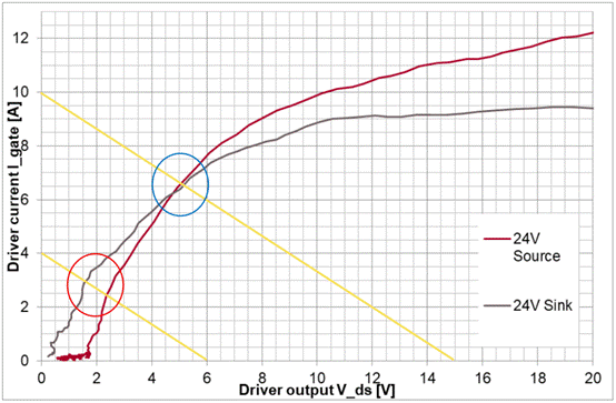 由此可見(jiàn),單純地給出一個(gè)驅(qū)動(dòng)電流值是無(wú)法直接判斷帶載能力的。我們需要更多的信息,比如芯片內(nèi)部末級(jí)輸出形式、定義值的點(diǎn)在哪?更為重要的是,功率器件的門(mén)極電阻影響極大。如果外部電阻很大的話(huà),會(huì)分掉更多的壓降,體現(xiàn)在圖7的電阻斜率更小,使得工作點(diǎn)左移,更近原點(diǎn)。如果這時(shí)候還看15V的電流能力就變得毫無(wú)意義了。而使用獨(dú)立的、電流更大的PMOS,可以解決NMOS作為共漏極輸出所需要的門(mén)檻電壓?jiǎn)栴},輸出特性線(xiàn)整體左移,疊加外電阻影響后,實(shí)際可以獲得更高的電流。