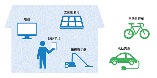 其他還有無(wú)繩吸塵器、熨斗等小型家電、電動(dòng)自行車(chē)、電動(dòng)摩托車(chē)等乘騎工具、利用家用太陽(yáng)能發(fā)電蓄積白天發(fā)的電等用途也都使用鋰離子電池。