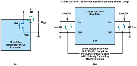 (b) Silent Switcher轉換器具有兩個(相反)熱回路和全集成開關。