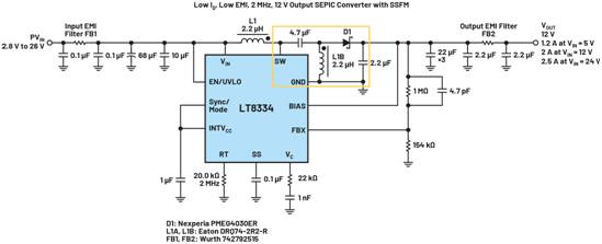 SEPIC轉化器熱回路(黃色突出顯示)包含一個分立式續(xù)流二極管和一個耦合電容,不會減弱輻射。