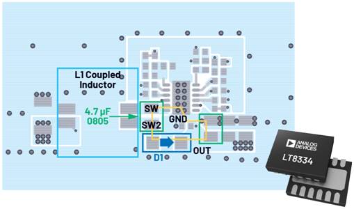 LT8334異步升壓轉換器中包含一個集成式5 A、40 V開關。這個單芯片升壓轉換器IC適合用于構建12 V輸出SEPIC轉換器。圖4顯示標準型12 V、2 A+ SEPIC轉換器,其中包含耦合電容C1和耦合電感的兩個電感線圈。由于微型PMEG4030ER續(xù)流二極管D1不是直接附加在開關節(jié)點上,所以可以輕松將4.7 μF 0805陶瓷型隔直耦合電容置于二極管和開關節(jié)點之間。在EVAL-LT8334-AZ SEPIC評估板上,熱回路布局保持較小。開關節(jié)點的銅面積盡可能保持較小,并且盡可能接近開關引腳,有助于盡可能降低電磁輻射騷擾。請注意,整個熱回路都布局在1層,且開關節(jié)點,或者耦合電容另一側的耦合開關節(jié)點上都沒有通孔。這些開關節(jié)點應盡量保持較小,且盡量接近,以實現出色結果。LT8334的12引腳DFN封裝有助于熱回路和輻射盡可能保持較小。