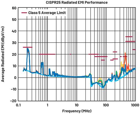 對低EMI評估電路(例如LT3950 DC2788A)進行了大量測試,以評估其電磁輻射和傳導輻射。圖9至圖11顯示成功的輻射測試結果,在測試時,SSFM開啟,采用12 V輸入,330 mA電流流經25 V LED串。電流探針和電壓方法CE的結果都通過了非常嚴格的限值標準。在開關中,很容易出現FM頻段CE挑戰(zhàn),但LT3950不受FM頻段影響。
