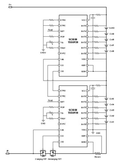 如有高壓高功率需求,需要用到6節(jié)以上串聯(lián)電池,SC5550支持可堆疊設(shè)計,單顆SC5550支持2~5串電池,通過2~3顆SC5550 堆疊,將可支持的串?dāng)?shù)拓展到6~15S。