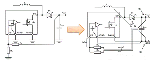 關(guān)于反饋路徑的布線,請注意以下幾點。左側(cè)電路圖單純是表示連接的電路圖,右側(cè)電路圖是標出了與(a)~(d)四個注意點相對應(yīng)的位置和布線的示意圖。